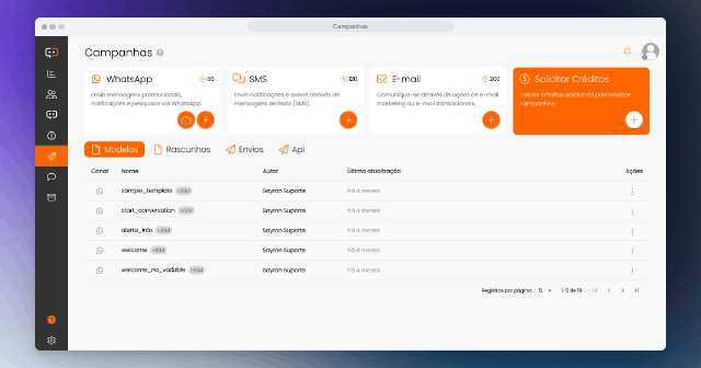 Acessando o módulo Campanhas, temos o recurso de disparo de SMS. Neste caso, a mensagem deve ser criada no momento do envio e inserida no campo de texto acompanhada da lista de contatos em formato “csv”.