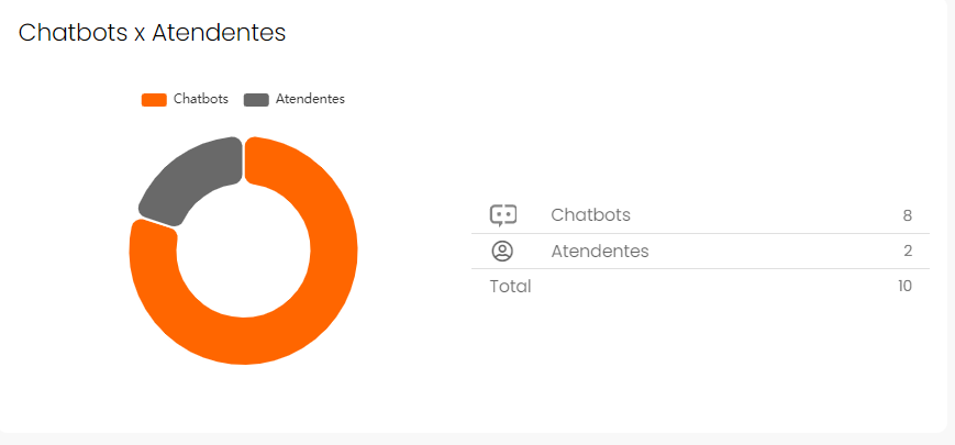 - Atendimentos do Chatbot em Relação aos Atendimentos por Atendentes: mostra o número total de atendimentos, destacando a participação do chatbot e dos atendentes.