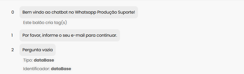 A função Base de dados funciona como um “validador” de informações. Ou seja, podemos inserir um ponto ao decorrer do fluxo do chatbot, onde iremos solicitar uma informação ao cliente/usuário final para que ele possa prosseguir.